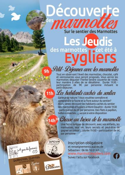 LE JOUR DE LA MARMOTTE le 22 juillet 2013 APEVM agit depuis 2011 pour que les marmottes d'Eygliers soient respectées en tant qu'animaux sauvages. Une campagne d'information et un parcours pédagogique ont été mis en place dès 2011 et l'an dernier une mise en défens des sentiers du site a été réalisé par Natura 2000 dans le cadre de la protection du Steppique Durancien. En protégeant les pelouses, les marmottes et leur milieu naturel sont ainsi préservés.